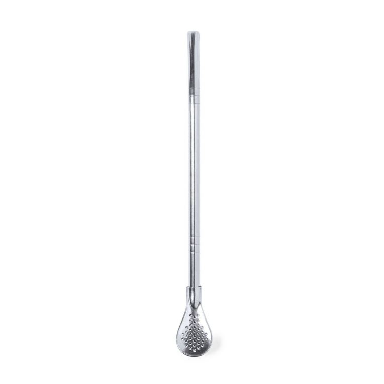 Agitateur pratique avec paille en acier inox. Avec un design élégant et fonctionnel, cet accessoire est essentiel pour les boissons chaudes ou froides. Paille intégrée qui permet d'absorber facilement et à l'extrémité inférieure une cuillère-mesure pratique avec filtre. Présenté dans un sachet individuel. (couleur argent)