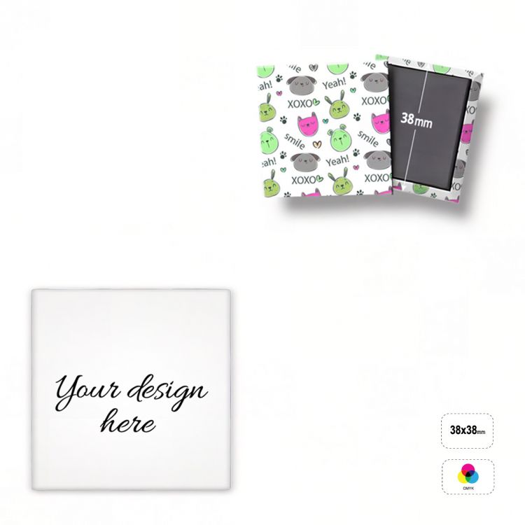 Aimant carré, en matériau acrylique laminé à la feuille magnétique. Le produit est entièrement personnalisable grâce à l'impression UV en quadrichromie.