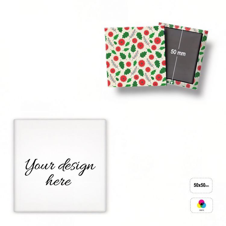 Aimant carré, en matériau acrylique laminé à la feuille magnétique. Le produit est entièrement personnalisable grâce à l'impression UV en quadrichromie.