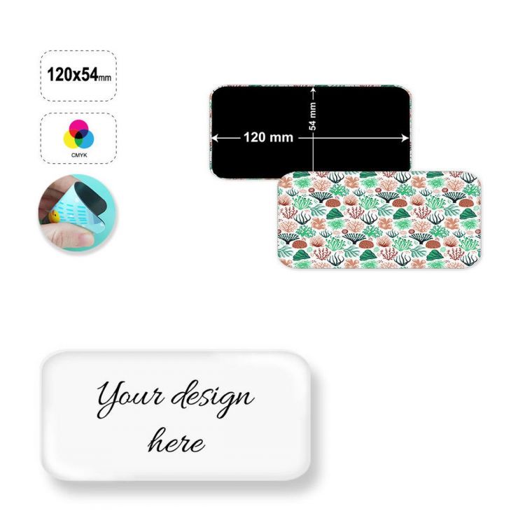 Aimant flexible rectangulaire fabriqué à partir d'une feuille magnétique laminée sur une surface en papier plastifié. Le produit est entièrement personnalisable au recto grâce à l'impression digitale.