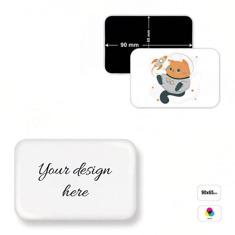Aimant rectangulaire, en matériau acrylique laminé à la feuille magnétique. Le produit est entièrement personnalisable grâce à l'impression UV en quadrichromie.