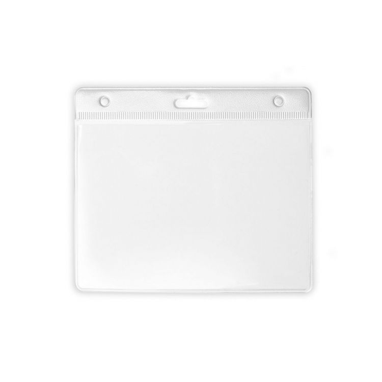 Badge perforé en PVC avec partie supérieure colorée, fenêtre frontale et partie arrière blanche.