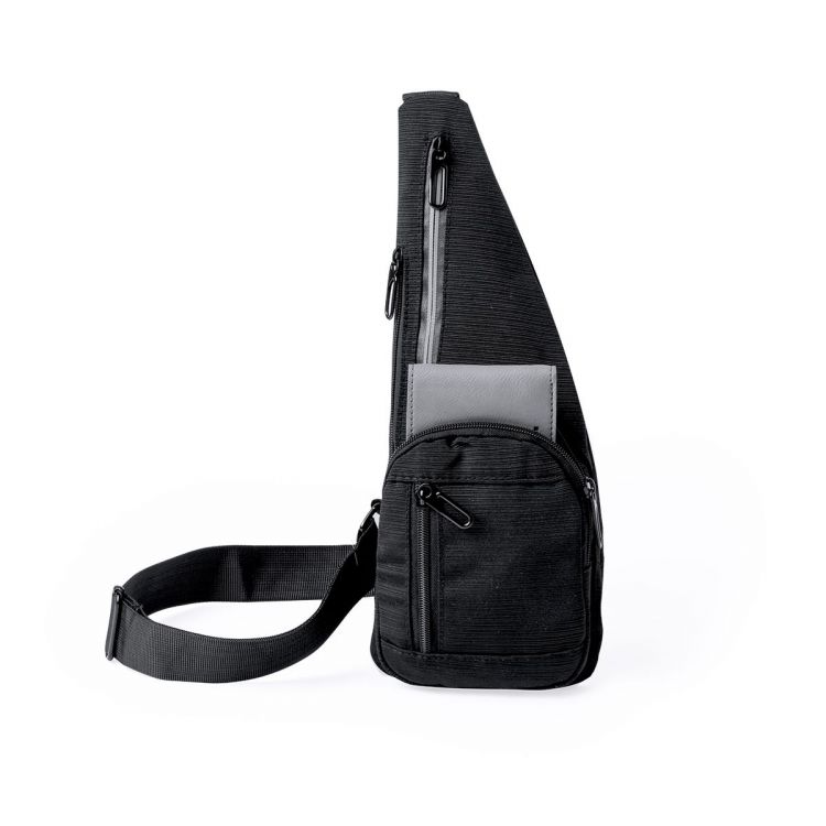 Bandoulière en polyester 300D, offre plusieurs poches pour une organisation efficace. Deux poches principales sont situées à l’avant et une sur le côté, avec deux poches supplémentaires à l’avant et à l’arrière. Elle se distingue par une bande réfléchissante dans la poche centrale pour améliorer la visibilité. Elle est présentée individuellement dans un sac recyclé. (couleur noir)