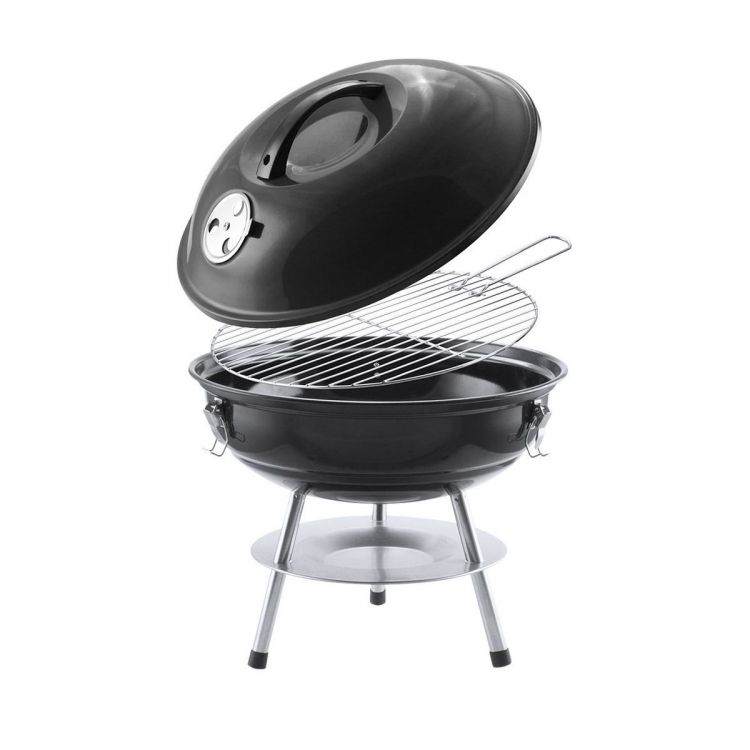 Barbecue en acier au carbone résistant en noir. Couvercle avec poignée confortable et trous de ventilation, avec grille métallique, plaque anti-goutte et pieds antidérapants. Présenté dans une boîte de design attrayante. (couleur noir)