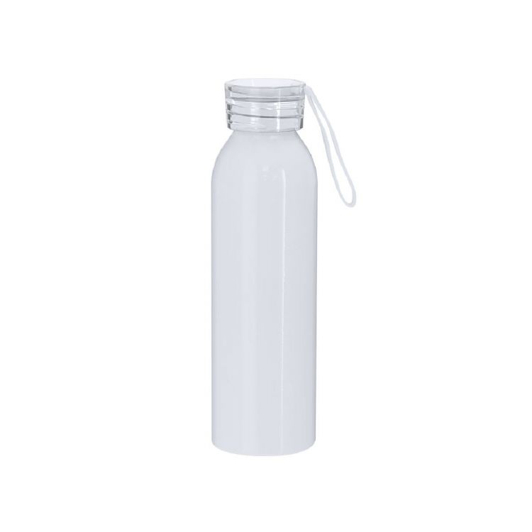 Bidon de 650 ml de capacité fabriqué en aluminium résistant. En couleur blanche brillante, spécialement conçu pour la sublimation. Avec un bouchon à vis translucide et un bracelet assorti pour un transport facile. Sans BPA. (couleur blanche)