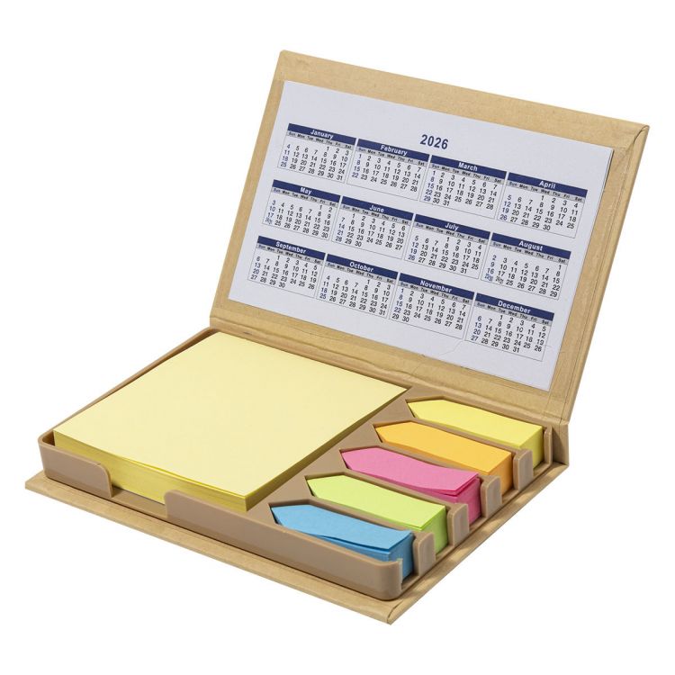 Bloc-notes adhésif en papier recyclé avec 100 notes jaunes et 500 marque-pages (5 couleurs). Calendrier sur 4 ans intégré à l'intérieur du couvercle, de couleur naturel