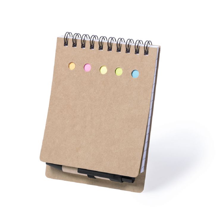 Bloc de notes adhésives à spirales avec stylo en carton recyclé inclus. Couverture ajourée au toucher doux en carton recyclé rigide et résistant. Comprend 50 feuilles lignées, 15 grands feuillets adhésifs et 75 marque-pages adhésifs. Stylo avec encre bleue. (couleur naturel)
