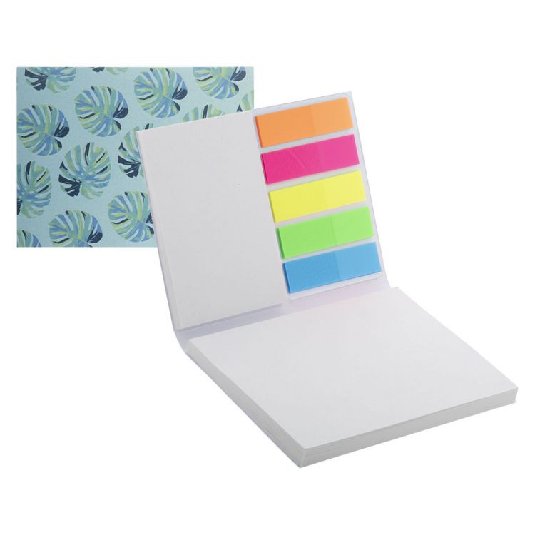 Bloc-notes autocollant sur-mesure, recouvert de papier. Comprend des feuilles autocollantes en papier recyclé de 2 formats (50 feuilles de 100×75 mm, 25 feuilles de 50×75 mm) et 100 marqueurs de page en film plastifié de 5 couleurs assorties (12×44 mm). Le prix× comprend la couverture extérieure imprimée en quadri. Quantité minimale de commande: 100 pièces