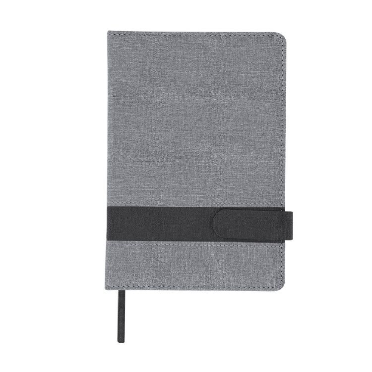 Bloc-notes A5 en cuir PU. Design gris élégant avec bande de fermeture magnétique noire. À l'intérieur, 80 feuilles de couleur crème, avec mise en page à une seule ligne et marque-page assorti en tissu. (couleur gris)