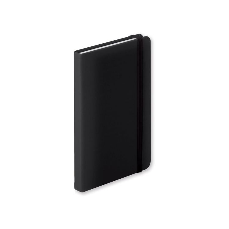 Bloc-notes couverture PU avec 100 feuilles lignées, marque-page et élastique caoutchouté. Format A6.