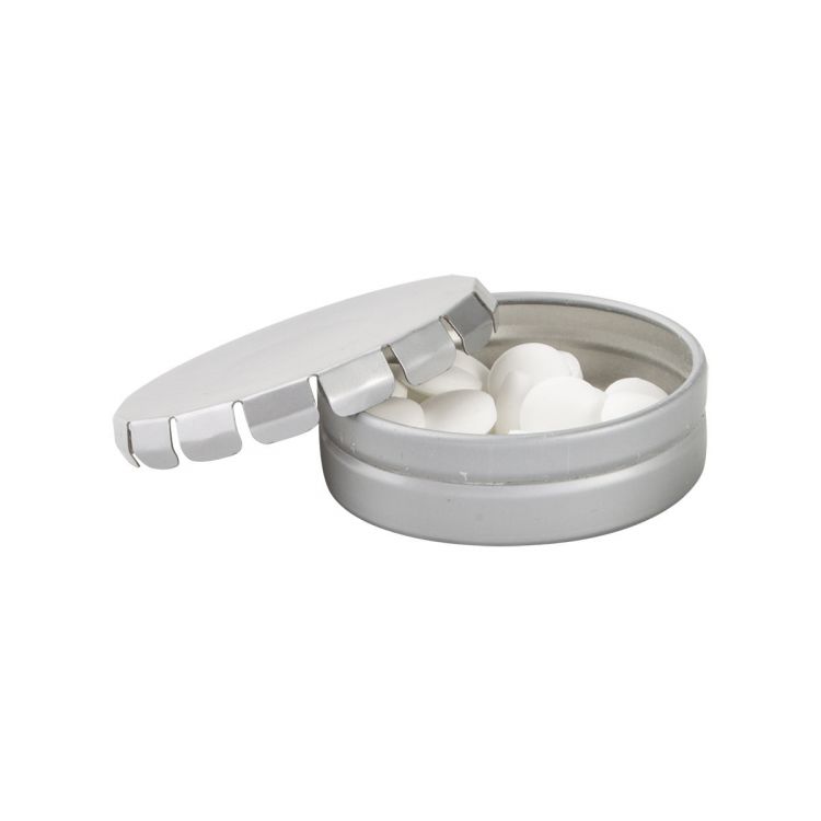 Boîte à bonbons à la menthe ronde en métal d'env. 12 grammes. Ouverture en appuyant sur le capuchon