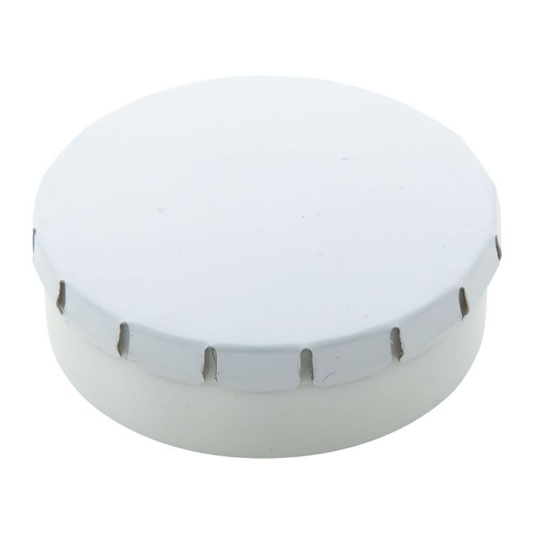 Boîte ronde à bonbons à la menthe avec couvercle en étain à ouverture facile. Contenant env. 12 grammes de bonbons, de couleur blanche