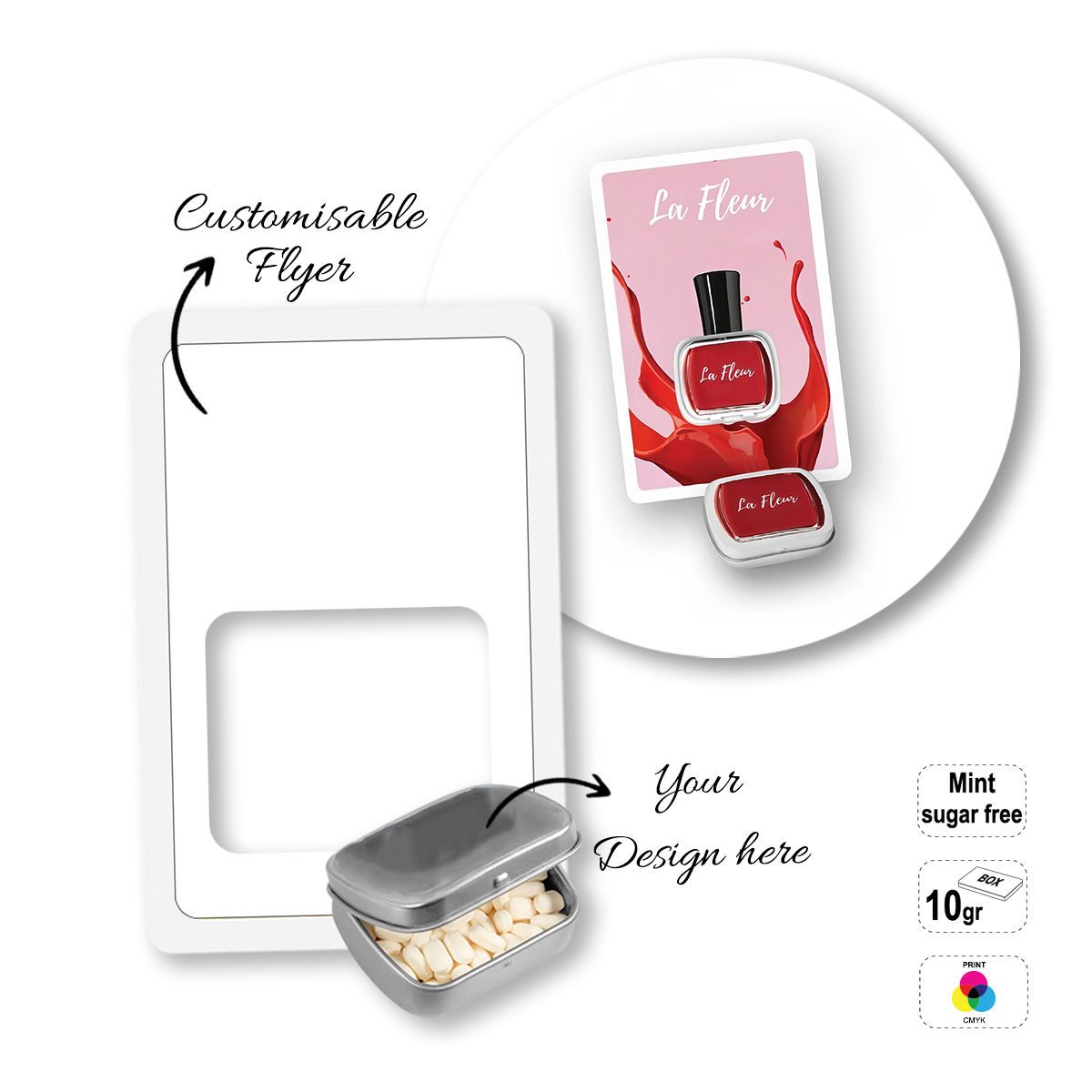 Boîte rectangulaire de bonbons à la menthe sans sucre (10 g) placée à l'intérieur d'un dépliant rectangulaire en carton. Les lettres du code produit correspondent à la taille et à la forme de la boîte : A- boîte rectangulaire de 10 g, B- boîte rectangulaire de 20 g, C- boîte ronde de 12 g. Emballage : boîte métallique réutilisable, dépliant en papier entièrement personnalisable (finition du papier : blanc ou kraft à choisir lors de la commande), plateau préformé en rPET. Durée de conservation minimale : 12 mois.