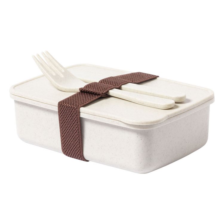 Boîte à lunch en plastique PP avec set de couverts (couteau et fourchette) et sangle élastique. 700 ml, de couleur naturel