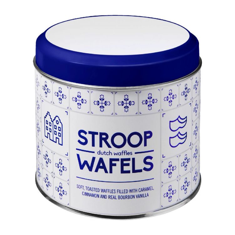 Boîte en étain neutre ou décorée de motifs typiquement néerlandais destinée à contenir des gaufres.