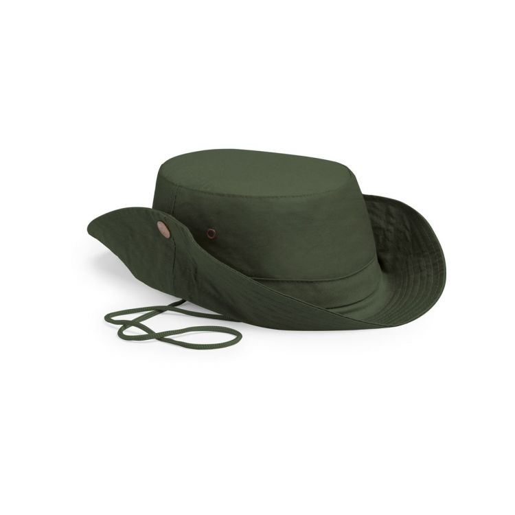 Chapeau de type safari en coton. Intérieur confortable avec orifices de ventilation latéraux renforcés par des œillets métalliques. Bords réglables par pression métallique et cordon assorti.