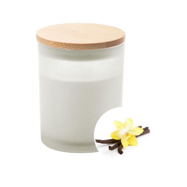 Bougie en cire végétale parfumée dans un support en verre dépoli avec couvercle en bambou. Avec 120 grammes de cire. Dans une boîte en papier kraft.