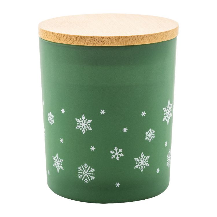 Bougie parfumée à base de cire végétale dans un support en verre givré avec motifs Noël de flocons et couvercle en bambou. Avec 120 grammes de cire. Dans une boîte en papier kraft.