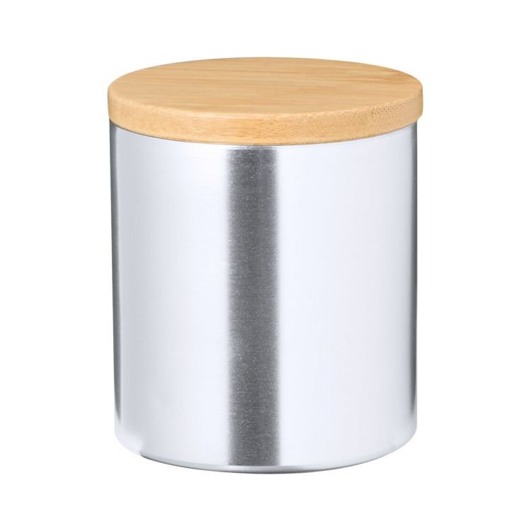 Bougie parfumée à la vanille dans un support en aluminium avec couvercle en bambou.