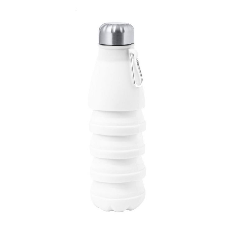 Bouteille de sport pliable en silicone avec couvercle en acier inoxydable et mousqueton. 550 ml, de couleur blanche