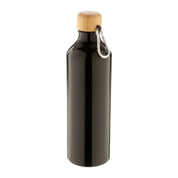 Bouteille en aluminium avec couvercle en bambou et mousqueton, 800 ml, de couleur noir