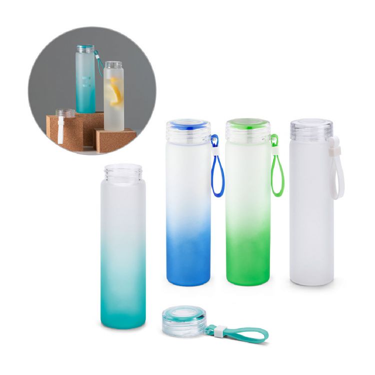 Gourde en verre borosilicaté avec bouchon à vis en AS. Avec une finition dégradée mate et une poignée en silicone sur le couvercle. Capacité jusqu'à 470 mL. Fourni dans une boite cadeau
