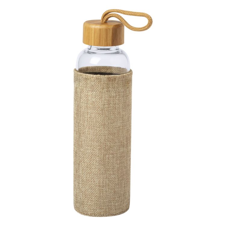 Bouteille en verre avec manchon en polyester de couleur naturelle, couvercle en bambou et dragonne, 500 ml. Ne convient pas aux boissons gazeuses