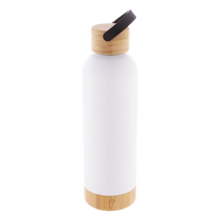 Bouteille isotherme à double paroi en acier inoxydable avec couvercle et base en bambou, 500 ml.