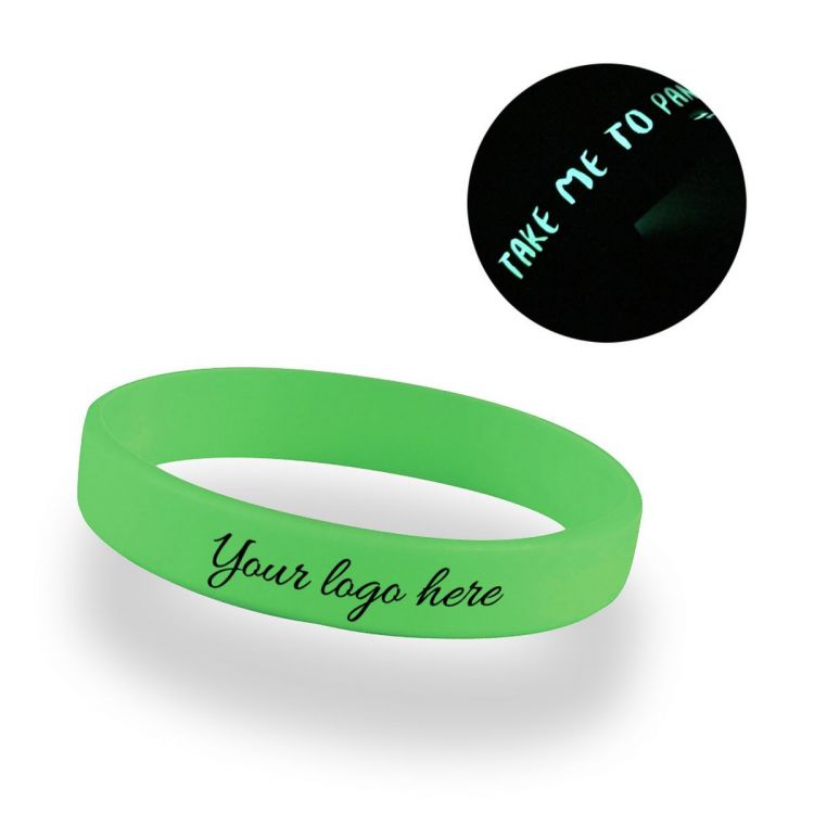 Bracelets en silicone personnalisés avec logo fluorescent. Le bracelet peut être personnalisé avec un logo gravé en bas relief sans couleur ou avec un logo coloré en 1 couleur.