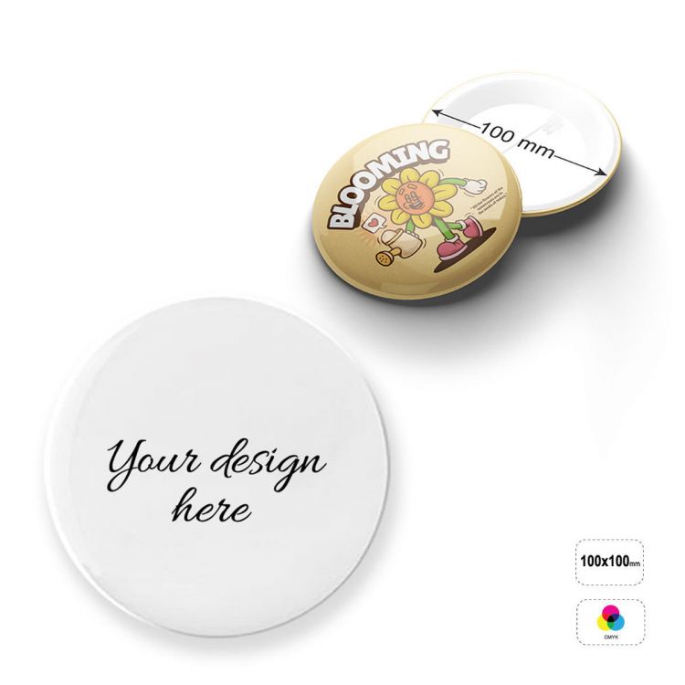 Épingle en fer-blanc, entièrement personnalisable. Le produit STANDARD comprend l'insert en papier plastifié avec impression numérique en couleur et l'attache classique de l'épingle en fer-blanc. Plusieurs finitions sont disponibles en option : brillant dans l'obscurité, réfléchissant, vernis UV, argent, or, papier à effet canva, effet peau de tatou, effet peau de lézard, paillettes, gaufrage. Différentes options pour le dos du badge sont également disponibles, au choix : pince crocodile, aimant, fermoir magnétique.