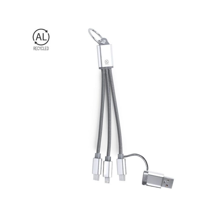 Câble de charge en aluminium recyclé. Avec connexion d'entrée dual Type C/USB et sorties Type C, Lightning et Micro USB. Inclut un label d'aluminium recyclé.L'aluminium recyclé est un matériau avec des possibilités de recyclage presque infinies, sans perdre ses propriétés d'origine et consommant moins d'énergie dans ce processus.Certification GRS (Global Recycled Standard / Standard de Recyclage Mondial), qui garantit l'origine recyclée du matériau utilisé pour fabriquer le produit.Connexion Micro USB, Type C et Lightning 5V CC 2.4A.