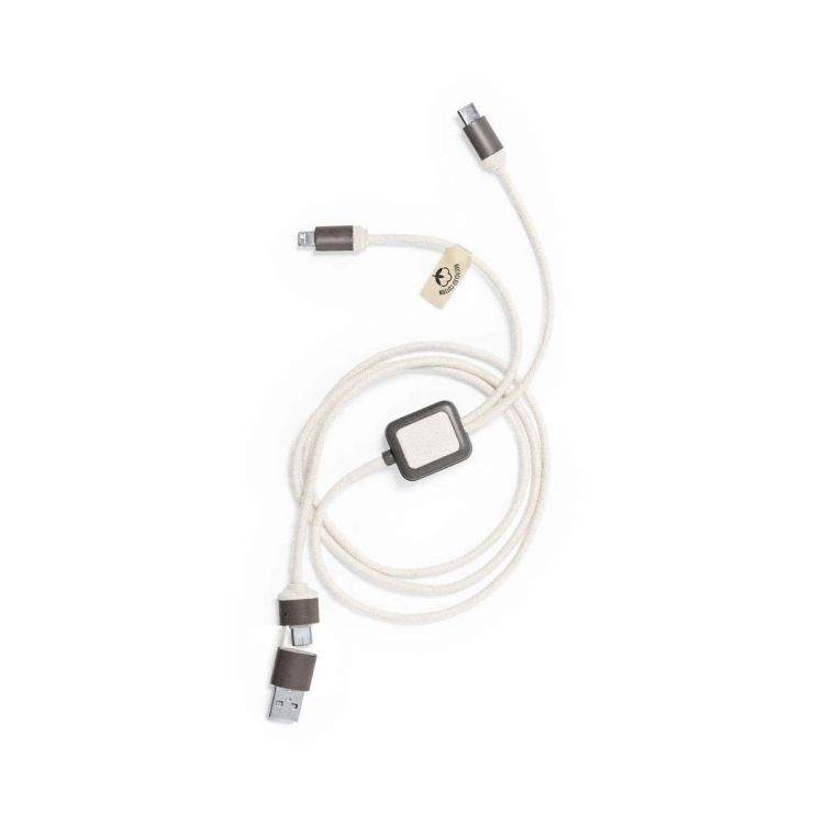 Câble de chargeur en fibre de café, avec câbles recouverts de coton recyclé. Connexions d'entrée de type C et USB, avec sorties de type C, Lightning et micro USB. CC 5V 2.4A. Avec fibre de café distinctive et coton recyclé. Présenté dans un sachet design kraft individuel à fermeture automatique.La fibre de café est une solution circulaire obtenue à partir de l'utilisation des déchets produits lors de l'obtention du café. Une alternative durable qui favorise la réduction de l'utilisation des plastiques, économise de l'énergie dans son processus de fabrication et contribue à la protection de l'environnement.Certification GRS disponible (Global Recycled Standard / Global Recycling Standard), qui garantit l'origine recyclée du matériau utilisé pour fabriquer le produit. (couleur marron)