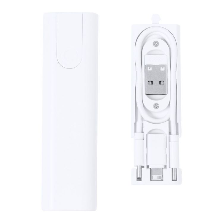 Câbles de chargeur USB dans un boîtier en plastique ABS avec fonction support mobile. Avec éjecteur de carte SIM et connecteurs micro USB, USB, USB-C et Lightning, de couleur blanche