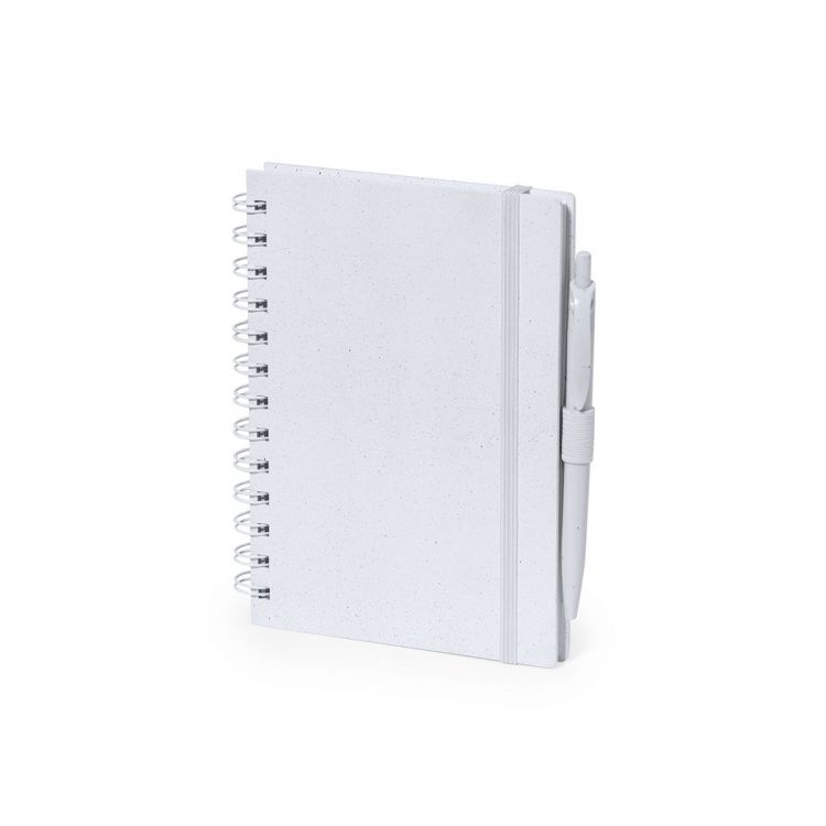 Ensemble carnet et stylo. Cahier à anneaux avec couvertures rigides en RABS et stylo assorti. Format A5, avec une fermeture élastique élégante disponible dans une grande variété de couleurs. Intérieur avec 70 feuilles blanches disposées en ligne. Stylo à bille à bouton-poussoir en RABS à encre bleue. Ils incluent le badge RABS. Présenté dans un sac recyclé individuel.