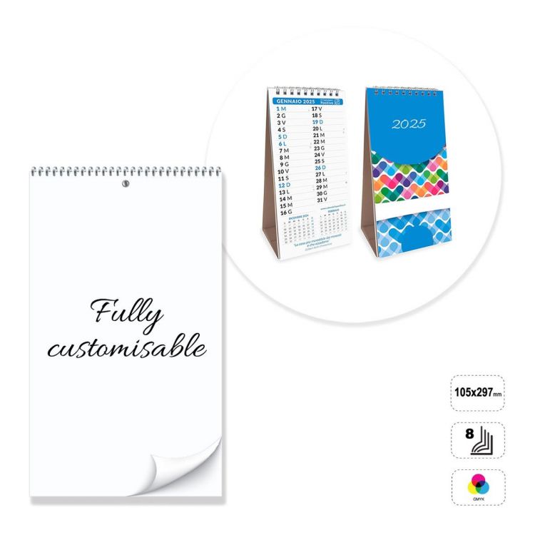 Calendrier de bureau vertical, entièrement personnalisable. Le produit se compose de 8 feuilles de papier couché mat de 135 grammes, imprimables au recto ou au recto et au verso en quadrichromie. Relié par une spirale métallique argentée, blanche ou noire en haut. Support en carton blanc 300 g non imprimable. Le calendrier peut être personnalisé en modifiant le modèle prédéfini, ou entièrement construit en suivant les directives fournies dans un modèle neutre.