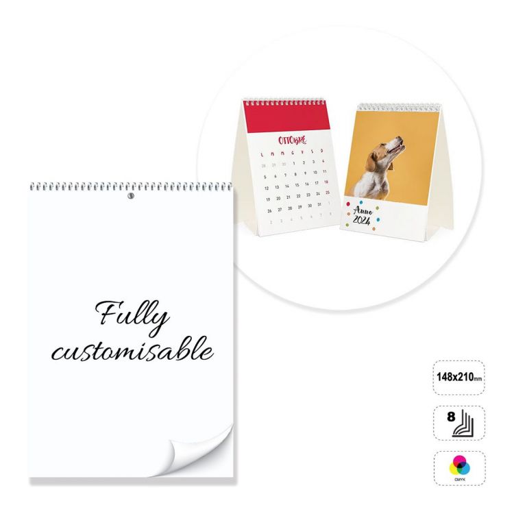 Calendrier de bureau vertical, entièrement personnalisable. Le produit se compose de 8 feuilles de papier couché mat de 135 grammes, imprimables au recto ou au recto et au verso en quadrichromie. Relié par une spirale métallique argentée, blanche ou noire en haut. Support en carton blanc 300 g non imprimable. Le calendrier peut être personnalisé en modifiant le modèle prédéfini, ou entièrement construit en suivant les directives fournies dans un modèle neutre.