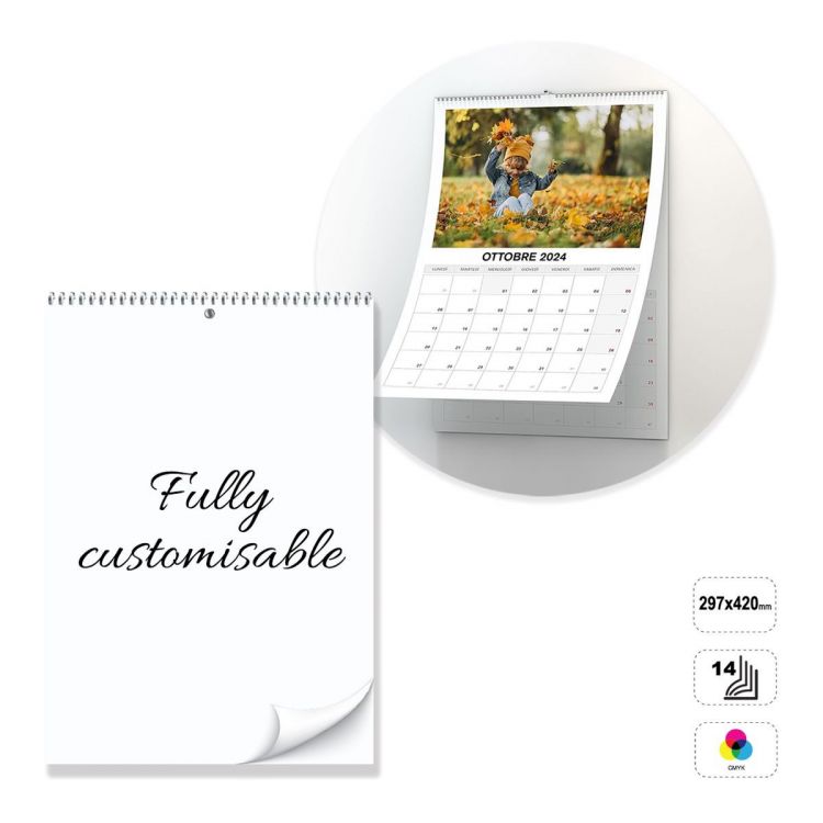 Calendrier mural vertical, entièrement personnalisable. Le produit se compose de 14 feuilles de papier couché mat de 135 grammes, imprimables au recto ou au recto et au verso en quadrichromie. Relié par une spirale métallique argentée, blanche ou noire en haut. Support en carton blanc 300 g non imprimable. Le calendrier peut être personnalisé en modifiant le modèle prédéfini, ou entièrement construit en suivant les directives fournies dans un modèle neutre.
