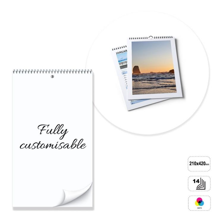 Calendrier mural vertical, entièrement personnalisable. Le produit se compose de 14 feuilles de papier couché mat de 135 grammes, imprimables au recto ou au recto et au verso en quadrichromie. Relié par une spirale métallique argentée, blanche ou noire en haut. Support en carton blanc 300 g non imprimable. Le calendrier peut être personnalisé en modifiant le modèle prédéfini, ou entièrement construit en suivant les directives fournies dans un modèle neutre.