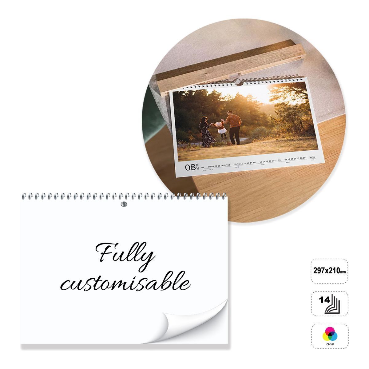 Calendrier mural horizontal, entièrement personnalisable. Le produit se compose de 14 feuilles de papier couché mat de 135 grammes, imprimables au recto ou au recto et au verso en quadrichromie. Relié par une spirale métallique argentée, blanche ou noire en haut. Support en carton blanc 300 g non imprimable. Le calendrier peut être personnalisé en modifiant le modèle prédéfini, ou entièrement construit en suivant les directives fournies dans un modèle neutre.
