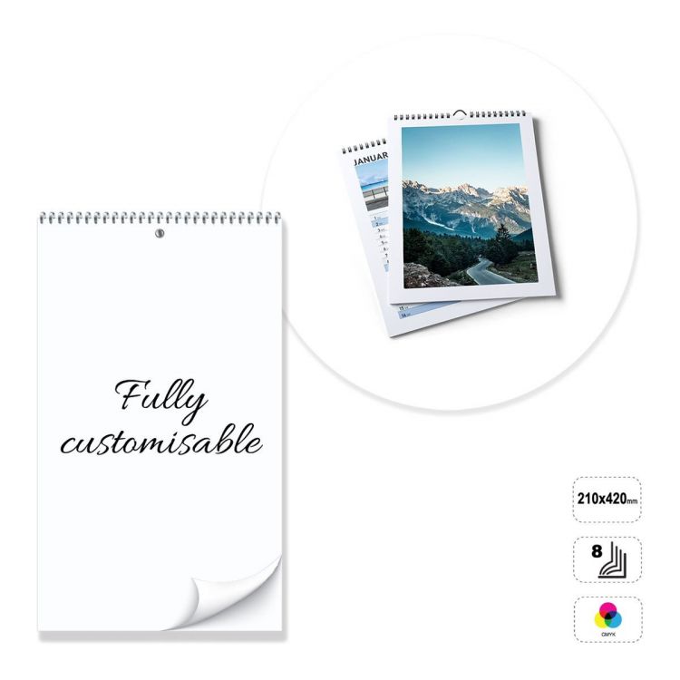 Calendrier mural vertical, entièrement personnalisable. Le produit se compose de 8 feuilles de papier couché mat de 135 grammes, imprimables au recto ou au recto et au verso en quadrichromie. Relié par une spirale métallique argentée, blanche ou noire en haut. Support en carton blanc 300 g non imprimable. Le calendrier peut être personnalisé en modifiant le modèle prédéfini, ou entièrement construit en suivant les directives fournies dans un modèle neutre.
