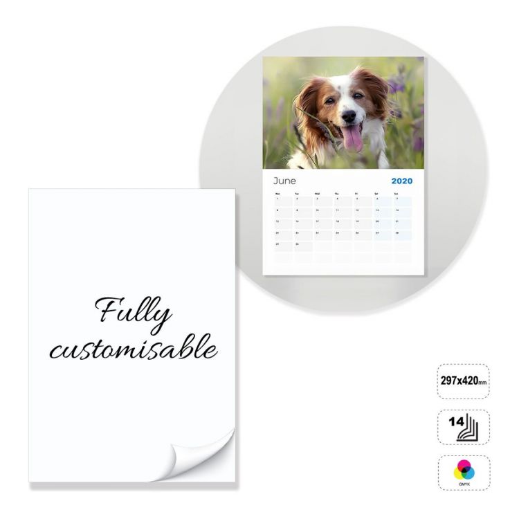 Calendrier mural vertical, entièrement personnalisable. Le produit se compose de 14 feuilles de papier couché mat de 135 grammes collées en haut avec un trou de 5 mm. Le produit peut être imprimé au recto en quadrichromie. Support en carton blanc 300 g non imprimable. Le calendrier peut être personnalisé en modifiant le modèle prédéfini, ou entièrement construit en suivant les directives fournies dans un modèle neutre.
