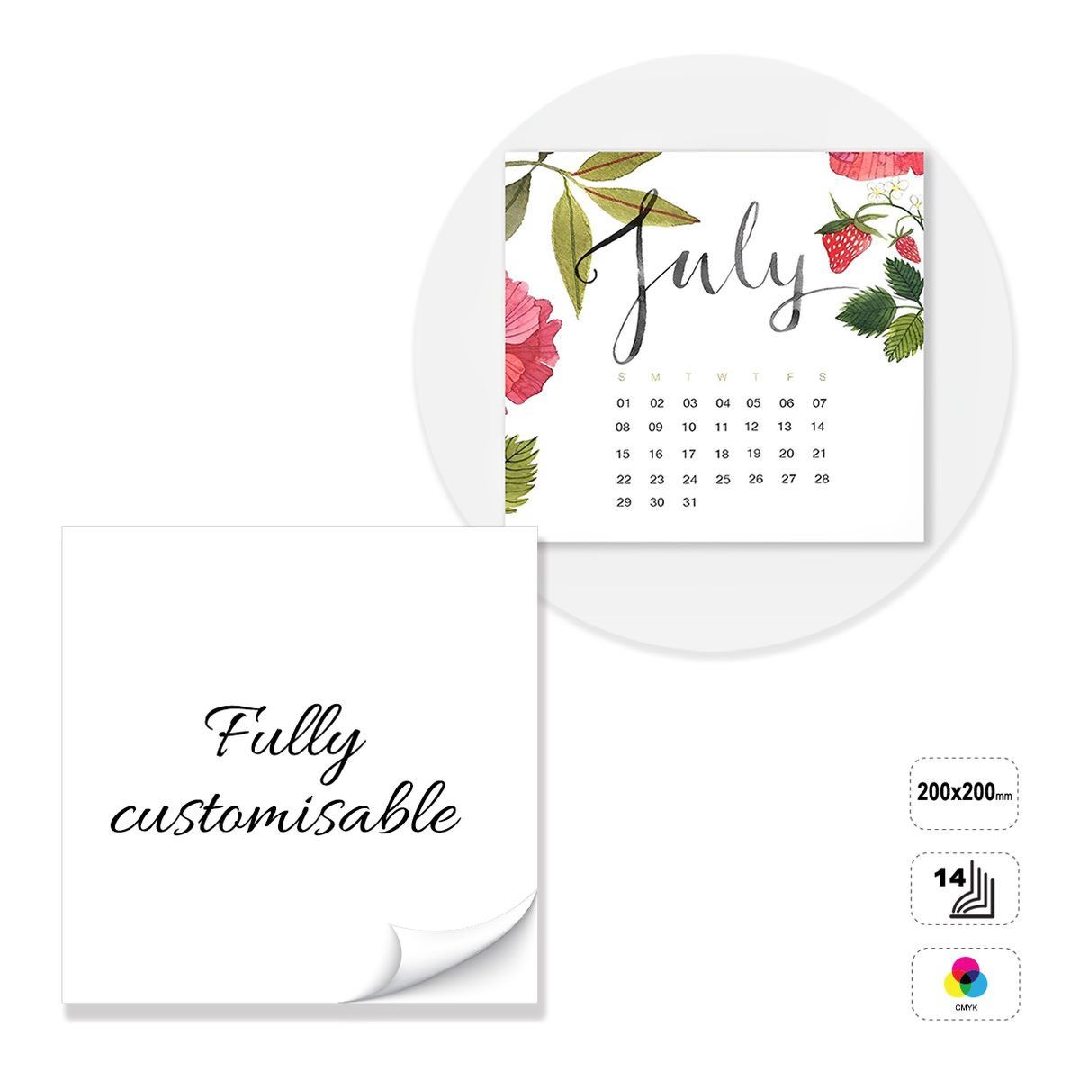 Calendrier mural carré, entièrement personnalisable. Le produit se compose de 14 feuilles de papier couché mat de 135 grammes collées en haut avec un trou de 5 mm. Le produit peut être imprimé au recto en quadrichromie. Support en carton blanc 300 g non imprimable. Le calendrier peut être personnalisé en modifiant le modèle prédéfini, ou entièrement construit en suivant les directives fournies dans un modèle neutre.