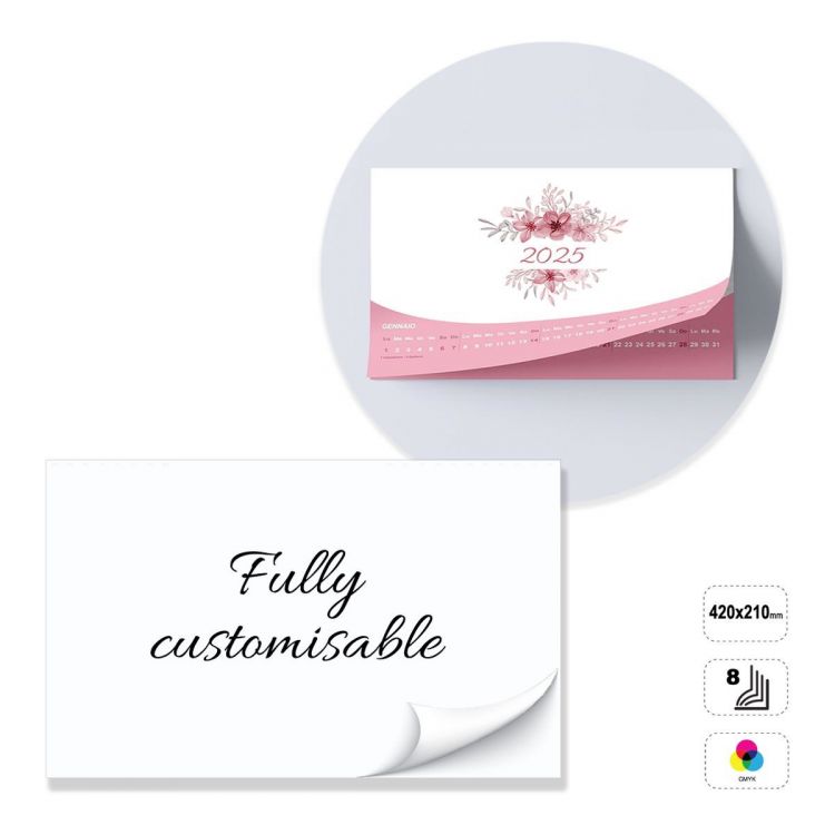 Calendrier mural horizontal, entièrement personnalisable. Le produit se compose de 8 feuilles de papier couché mat de 135 grammes collées en haut avec un trou de 5 mm. Le produit peut être imprimé au recto en quadrichromie. Support en carton blanc 300 g non imprimable. Le calendrier peut être personnalisé en modifiant le modèle prédéfini, ou entièrement construit en suivant les directives fournies dans un modèle neutre.