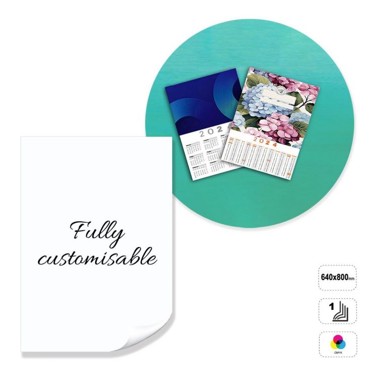 Calendrier vertical, entièrement personnalisable. Le produit est fabriqué en papier couché mat de 350 grammes, imprimable au recto en quadrichromie. Possibilité de pelliculage au recto, au choix : brillant, mat ou soft touch. Le calendrier peut être personnalisé en modifiant le modèle prédéfini, ou entièrement construit en suivant les directives fournies dans un modèle neutre.