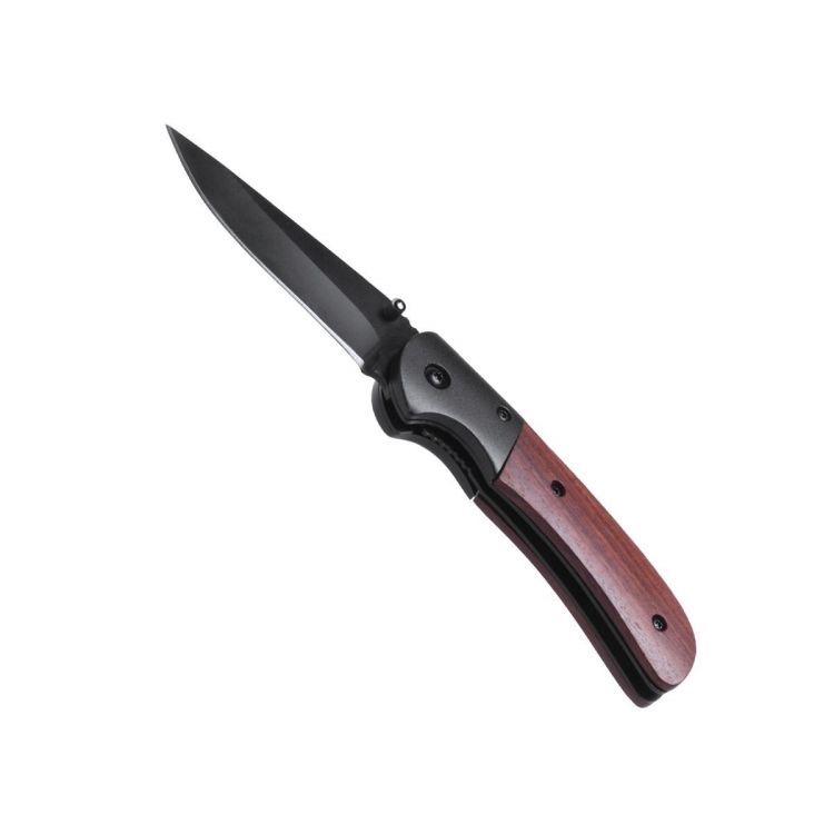 Canif de grande qualité avec lame noire en acier inoxydable et manche en bois naturel avec cran d´arrêt. Présenté en boîte individuelle. (couleur naturel)