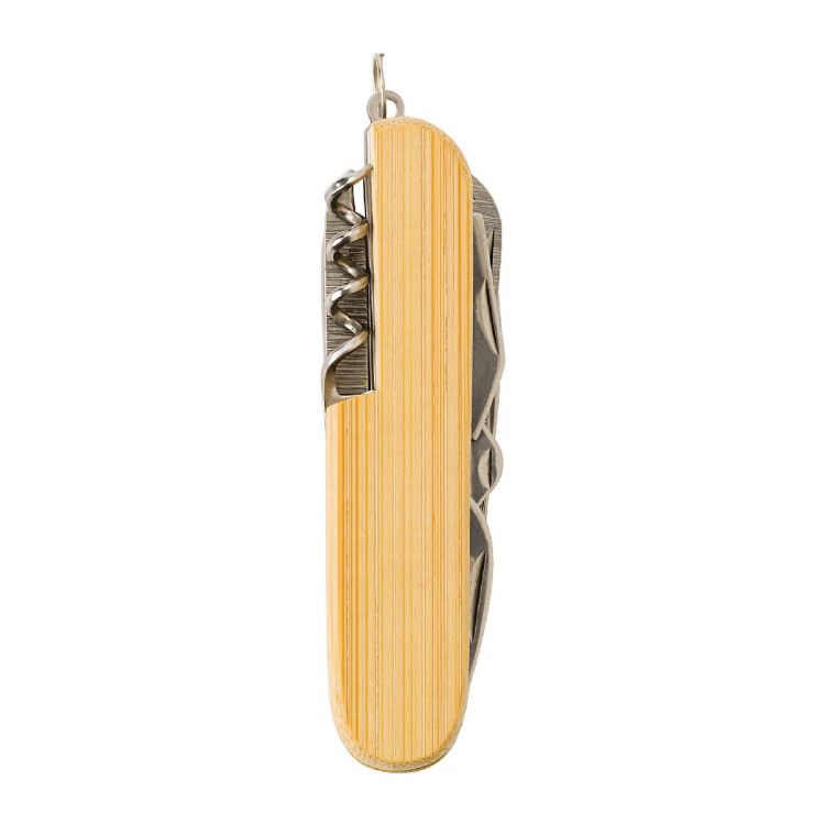 Canif multifonction en bambou et acier inoxydable.