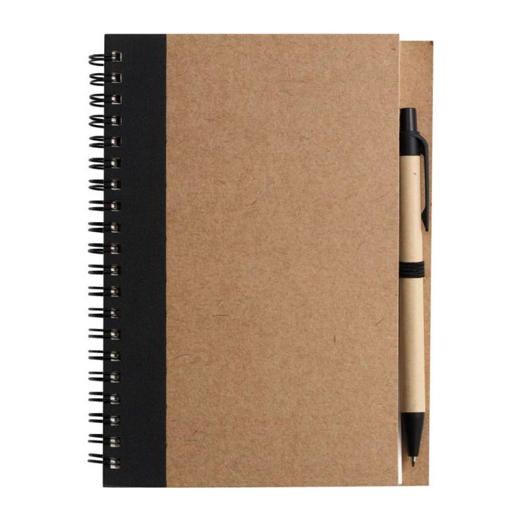 Carnet à spirale en carton et papier recyclés contenant 60 feuilles lignées, livré avec stylo bille recyclé, mine bleue.