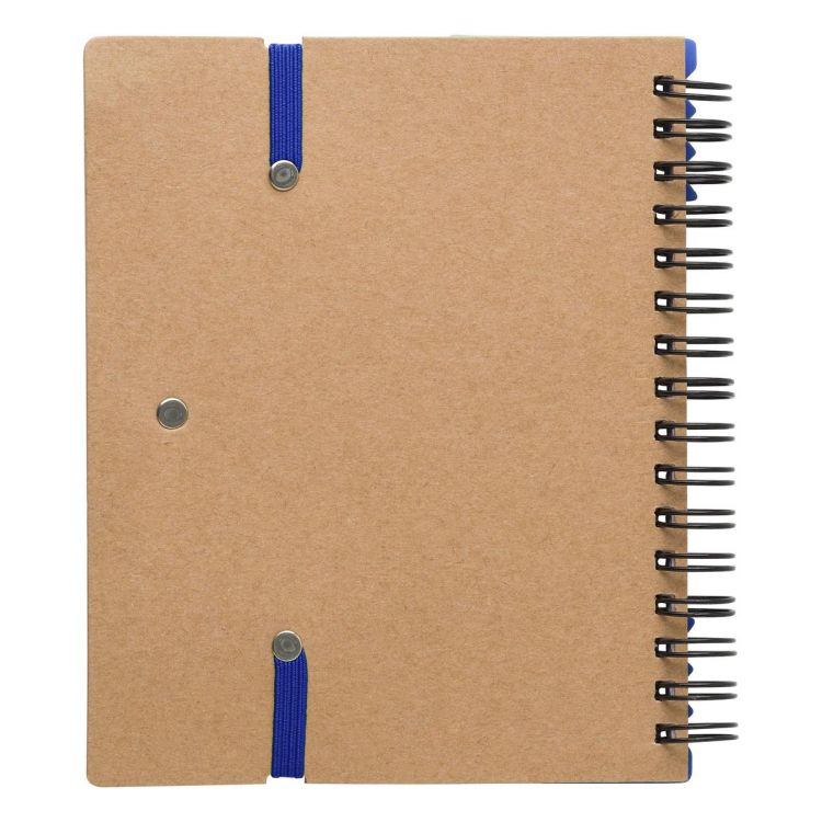 Carnet à spirale en papier recyclé avec fermeture élastique contenant 60 feuilles lignées, 25 marque pages repositionnables par coloris, une règle et un stylo bille, mine noir.