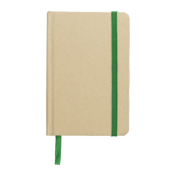Carnet A6 en matériau recyclé contenant 80 feuilles lignées avec fermeture élastique et marque-page.