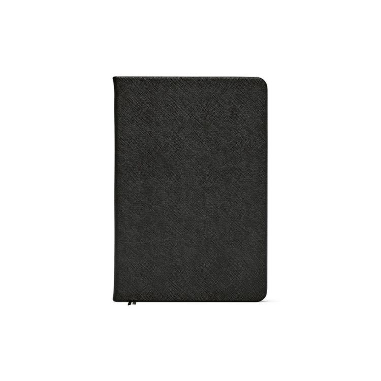 Carnet Wilde avec couverture rigide en PU recyclé. Intérieur avec deux poches pratiques pour documents. Deux marque-pages en ruban facilitent la navigation dans ses 196 pages couleur ivoire à points en papier issu de forêts durablement gérées (80 g/m²), avec espace pour date et pagination. Allie choix engagé et praticité. Inclut une plaque métallique personnalisable à coller sur la couverture. Livré dans une pochette kraft individuelle., de couleur noir